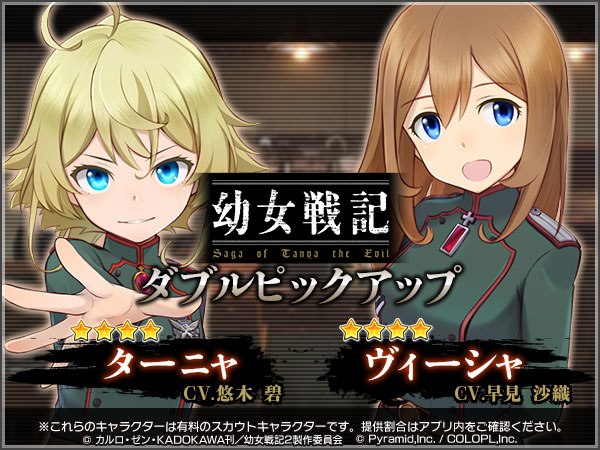 「ターニャ(CV:悠木 碧)」と「ヴィーシャ(CV:早見 沙織)」の、ふたりの★4キャラクターをダブルピックアップしたスカウトが開催中です。