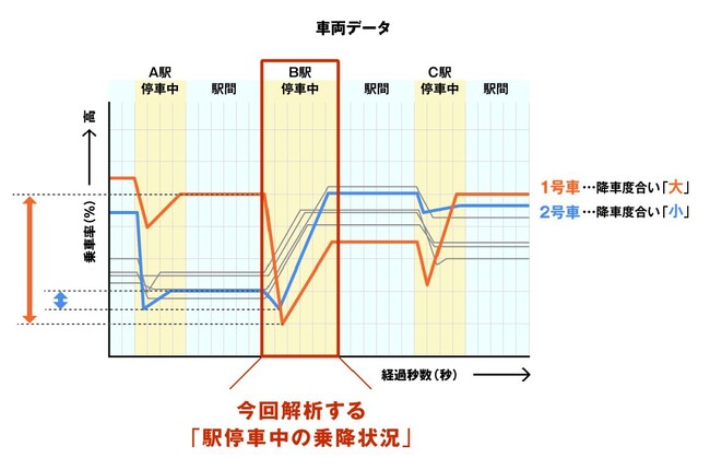 東京メトロの各路線を走行する車両から取得される車両データから、列車が駅に到着してから出発するまでの乗降状況(曜日・時間帯ごとの降車度合)を「号車ごと」に「1秒間隔」で解析し、東京メトロ各駅の「座りやすさに関する特性」を可視化します。さらに、ナビタイムジャパンのデータ加工及びシミュレーション技術を用いることで、乗車している列車のある駅からの座れる可能性を示す「着座確率」を推定します。