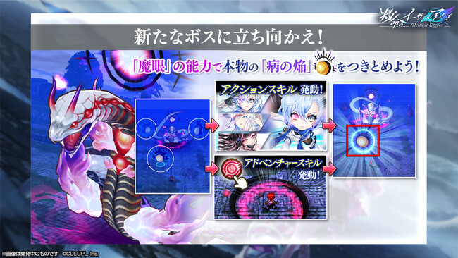 新イベント「救命のイーヴィルアイズ -medical trigger-」は、「医療」と「魔眼」をテーマにした新シリーズのイベントとなっております。キャラガチャに登場する新キャラクターの「フーシャ(CV:本渡楓)」「リンド(CV:藤原夏海)」「メラルーカ(CV:木野日菜)」が、病を司る神獣<ヤマタ>に立ち向かうシリアスでハードなシナリオをお楽しみいただけます。クエストではアドベンチャースキル「魔眼」を実装し、キャラクター達の「魔眼」をクエストを通して体験することができます。