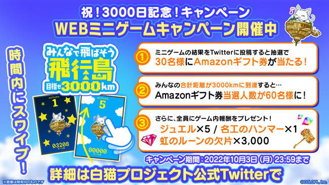 2022年9月30日(金)『白猫』はアプリをリリースして3000日を達成いたしました。こちらを記念したキャンペーンを開催しております。期間中、300個以上のジュエルなどゲーム内アイテムをたくさんもらえるキャンペーンや、前述した特別なジュエルパックの販売、Amazonギフト券が手に入るWEBコンテンツなど、さまざまな施策を用意いたしましたので、ぜひご参加ください。
