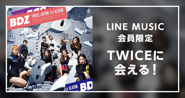 本キャンペーンでは、本日リリースされたばかりの『TWICE』の日本1stアルバム『BDZ』収録楽曲を、「LINE MUSIC」でより多くフル尺再生で聴いていただいた会員*1の方を優先的に、千葉・幕張イベントホール、兵庫・神戸ワールド記念ホールの公演での、Meet & Greetに各5名のLINE MUSIC会員様をご招待いたします。