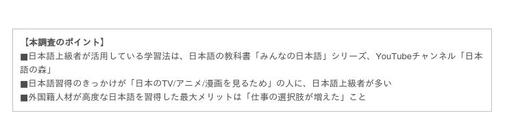 調査目的:日本語能力により、日本での就労に苦労する外国籍ビジネスパーソンに役立つ日本語習得方法を導く