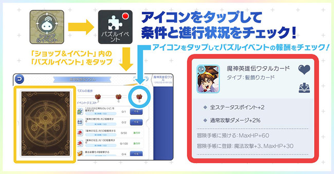 期間中にイベントクエストをクリアして、パズルのピースを開放しましょう。ピース1つを開放するごとに「古く青い箱・夢幻」×1を、ピースを3つ開放するごとに追加報酬をゲットすることができます。パズルを完成させて、「魔神英雄伝ワタルカード」を手に入れましょう。