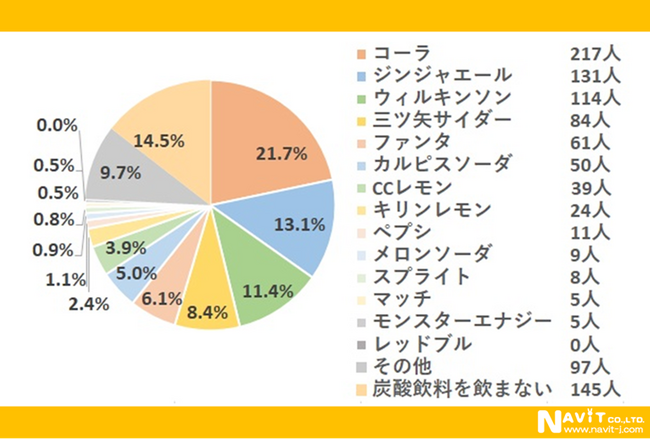 最も好きな炭酸飲料は「コーラ」がトップで217人。次いで3ケタ台の回答があったのは「ジンジャエール」131人と「ウィルキンソン」114人でした。
