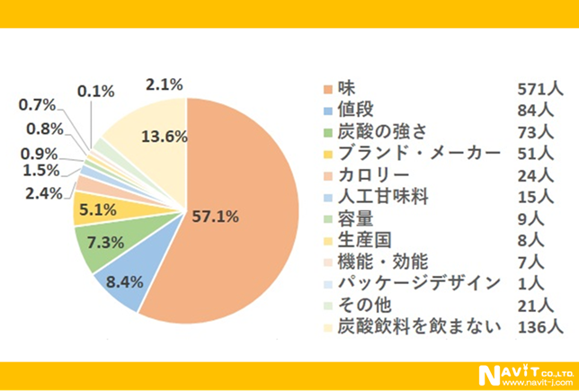 炭酸飲料を選ぶ際に最も重要視するのは「味」がトップで571人。2位の「値段」84人以下を大きく引き離しています。