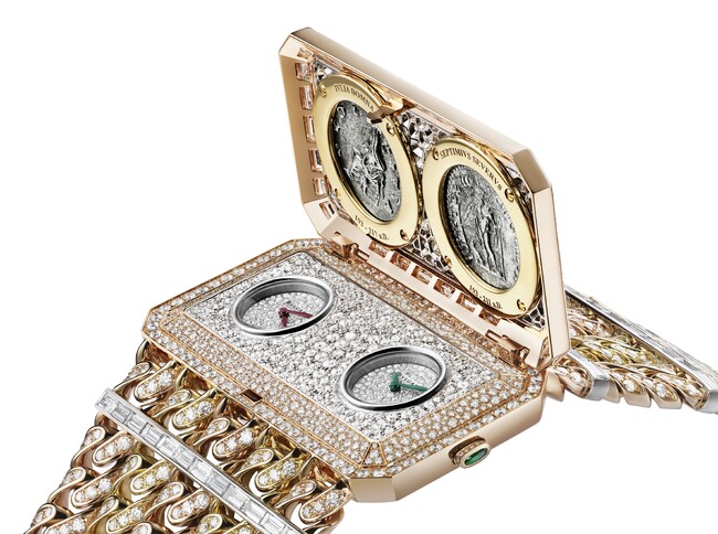 ケース/ブレスレット/ダイヤル:ピンクゴールド/イエローゴールド/ホワイトゴールド製、バケットカットダイヤモンド(約21.76ct)、ブリリアンカットダイヤモンド(約20.8ct)、セプティミウス・セウェルス皇帝(193-211AD)と皇妃ユリア・ドムナ(193-217AD)のデナリウス硬貨がセットされたケースカバー、2石のエメラルドカボション(約0.12ct)