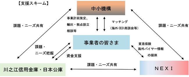 中小機構(独立行政法人中小企業基盤整備機構)四国本部は、日本政策金融公庫(略称:日本公庫)松山支店、川之江信用金庫、日本貿易保険(略称:NEXI)とともに、海外展開に取り組む中小企業・小規模事業者への支援の強化を目指し、「海外ビジネス支援パッケージ」による連携を開始いたしました。