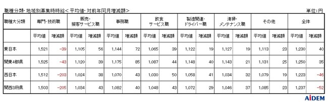 職種大分類別の平均時給は、「専門・技術職」1,521円(前年同月比39円減)、「事務職」1,144円(同72円増)、「清掃・メンテナンス職」1,127円(同19円増)、「製造関連・ドライバー職」1,122円(同19円増)、「販売・接客サービス職」1,105円(同56円増)、「飲食サービス職」1,065円(同39円増)の順で、前年同月比でプラスが5職種、マイナスが1職種となった。