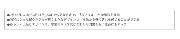 ●内 容:「桜」をイメージしたネイルデザイン全12種類を用意しました。満開になった桜や花びらが舞うようなデザインは、指先を見るたびに春の訪れを感じることができます。