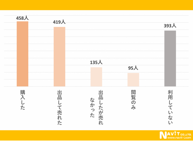 フリマアプリの利用法について複数回答でアンケートを行いました。その結果、1番多かったのが「購入した」が458人で次に多かったのが「出品して売れた」が419人となっています。
