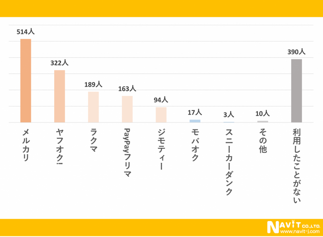 どのフリマアプリを利用したことがあるかというアンケートに対して、1番多かったのが「メルカリ」で514人です。次に多かったのが老舗の「ヤフオク!」が322人と続いています。メルカリと同時期にリリースされた「ラクマ」が3番目で189人となっています。