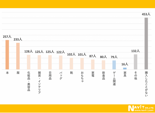 フリマアプリで購入される商品で1番多かったのが「本」で257人です。次が「服」で233人となっています。次が「化粧品・美容品」が128人と続いていますが、他のカテゴリの物も同じような人数が購入しているようです。