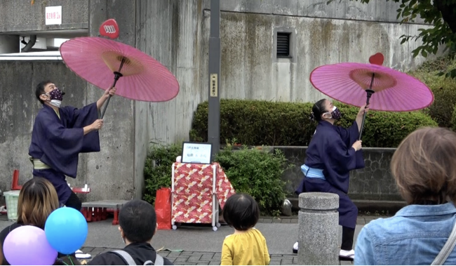 お正月やお祝いの日によく見かける日本伝統の演芸・番傘にマリや枡をのっけて回す“太神楽”。