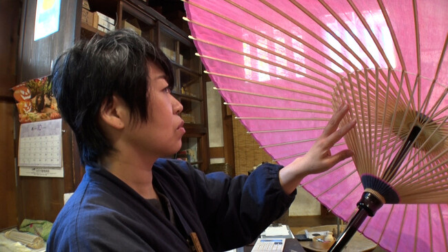 普通の番傘と違い、回す人から枡やマリがみえるように和紙ではなく寒冷紗という透ける布を使い作る曲芸用の傘。 今回は2段の番傘のため下から回す物体が見えづらい。そこで最新のミラーレースカーテンの生地とコラボしイッテンモノの傘作りがスタート!果たしてどうなる?