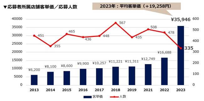 ・応募者所属店舗客単価は年々上昇傾向にあるが、2023年は35,946円と昨年より19,258円高くなり大幅にアップ。