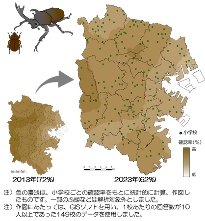 2023年は、160校、10,061人の小学生が回答し、里地里山的環境を指標するカブトムシの確認率が減少傾向であることなど、今後の生物多様性保全に資する貴重な情報を得ることができました。