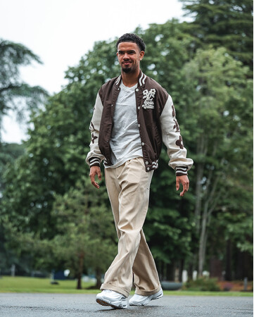 ワレン・ザイール=エムリは、ブラウンのナイロンとホワイトレザーのバーシティジャケットにホワイトのモノグラムTシャツ、ベージュのプリーツ入りチノパンを合わせました。