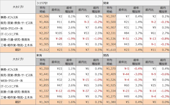 エリア別の平均時給について、関東エリアは1,610円(前年比+23円、前月比+11円)、東海エリアは1,369円(前年比+22円、前月比+1円)、関西エリアは1,380円(前年比+5円、前月比±0円)となりました。