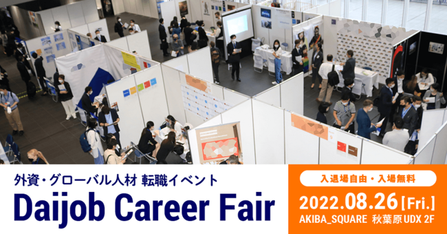 ビジネス・プロフェッショナル×バイリンガルのための転職・求人情報サイト「Daijob.com」を展開するヒューマングローバルタレント株式会社(本社:東京都新宿区、代表取締役:横川 友樹、以下「当社」)が、転職イベント「第45回Daijob Career Fair」を2022年8月26日(金)にAKIBA_SQUARE(東京都:秋葉原)で開催します。 (https://www.daijob.com/cfair/place/51)