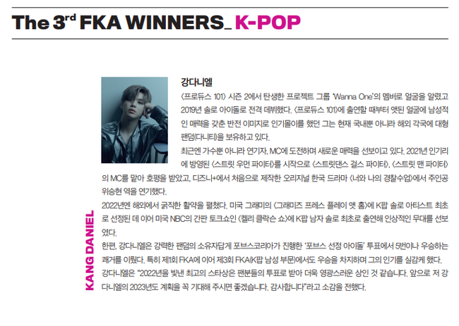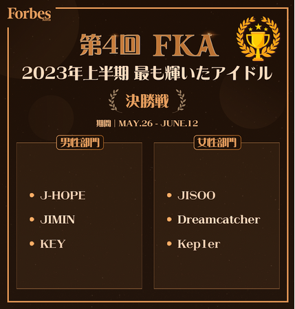 Forbes Koreaが主催する「世界中のK-POPファンを対象に行われる投票」で「2023年上半期最も輝いたアイドル(男性・女性アイドル部門)」を決定するアワードです。