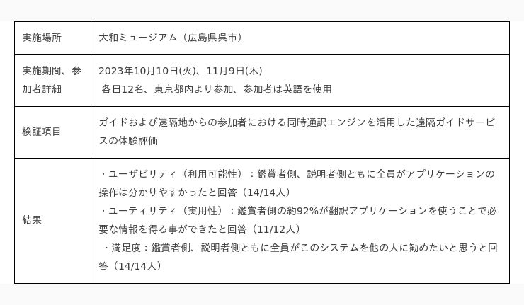 この度、同時通訳技術の社会実装に向け、本研究で開発を行っている同時通訳エンジンを活用し、博物館やショールームのガイドを、遠隔地からの複数の参加者に対し同時通訳で実施する実証実験を、大和ミュージアム(広島県呉市)とTOPPANグループのショールーム「PLAZA21小石川」(東京都文京区)の2拠点で、2023年10月〜11月にかけて複数回行いました。また、今回の実証では、翻訳結果の不明点などをワンタップで参加者からガイドにお知らせできる新機能を追加。ガイドと参加者への体験評価の結果、遠隔からのガイド/鑑賞というシーンにおいて、同時通訳技術を活用したサービスの有用性を確認しました。