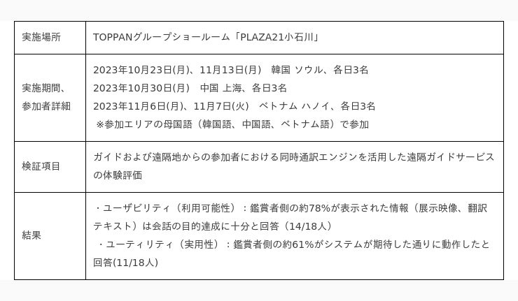 TOPPANは、本実証を踏まえた同時通訳技術を活用した遠隔ガイドサービスの構築を進め、2024年9月からの販売開始を目指します。同時通訳技術の社会実装を通じて、多言語コミュニケーション基盤を構築し、外国人との円滑なコミュニケーションの実現を目指します。