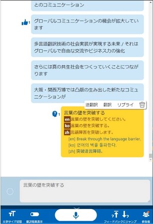 さらに、今回のアプリケーションには新たに開発した機能「わからないを伝えるUI」を追加しました。この機能は、参加者側が翻訳結果に不明点がある場合に、ガイド側へその旨をワンタップで簡単に伝えることが可能です。ガイド側はどの発言が指摘されているかを知ることができるとともに、逆翻訳結果(外国語に翻訳した結果を日本語に翻訳し戻した結果)の表示により、参加者側の言語でどのように伝わっているかも分かるため、状況に応じて説明をやり直すことができます。本実証では本機能の活用により、ガイドと遠隔地からの参加者とのより円滑なコミュニケーションを実現しました。