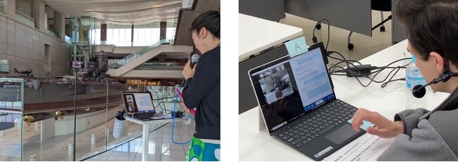 本実証では、同時通訳エンジンを使用したアプリケーションと、Web会議システムを組み合わせることで、海外などの遠隔地にいる参加者に対して現地の展示品やガイドの顔を見せながらの説明を実施。参加者からは、特に日本語から英語・中国語・韓国語の翻訳精度において高い評価を得ることができました。また、同時通訳技術の活用により、ガイドの発話が終了する前から発話の一部を訳出し始めることができるため、タイムラグの少ないガイド説明を実現しました。