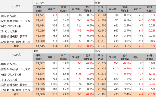 エリア別の平均時給について、関東エリアは1,645円(前年比56円増、前月比2円減)、東海エリアは1,380円(前年比37円増、前月比2円減)、関西エリアは1,408円(前年比33円増、前月比2円減)となりました。