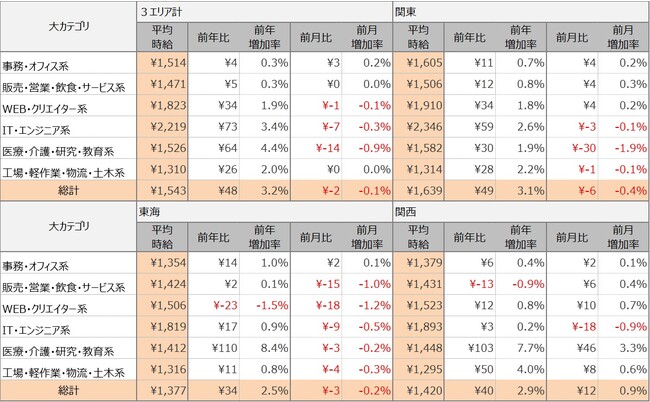 エリア別の平均時給について、関東エリアは1,639円(前年比49円増、前月比6円減)、東海エリアは1,377円(前年比34円増、前月比3円減)、関西エリアは1,420円(前年比40円増、前月比12円増)となりました。