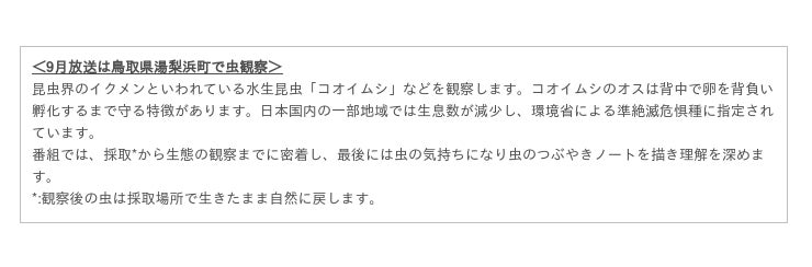 また、虫が苦手な方でも、少しずつ興味をもってもらえるような番組を作りますので、皆さまが楽しめる番組です。ぜひご覧ください!