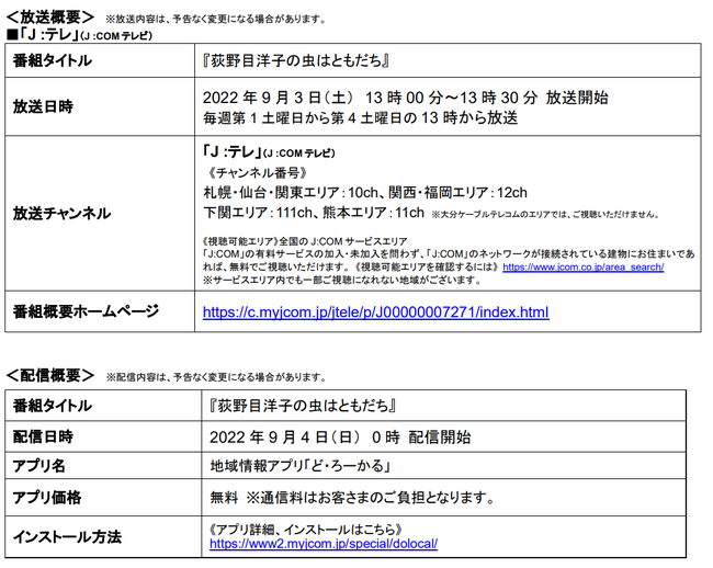JCOM株式会社(J:COM、本社:東京都千代田区、代表取締役社長:岩木 陽一)は、荻野目洋子さんをMCにお迎えし生き物の命の大切さを伝える番組『荻野目洋子の虫はともだち』を、2022年9月3日(土)13時よりJ:COMのコミュニティチャンネル「J:テレ」(J:COM テレビ)で放送開始します。