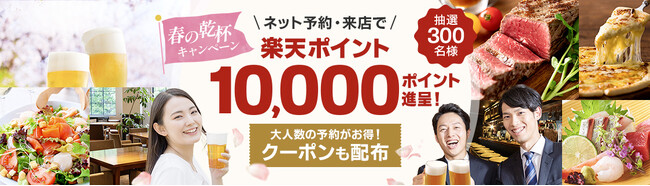 本キャンペーンでは、対象の飲食店でランチ1,500円以上、ディナー3,000円以上のコースを2名以上でネット予約・来店した方から抽選で300名様に「楽天ポイント」10,000ポイントを進呈します。さらに、宴会幹事に向けて大人数の予約がお得になるクーポンとして「ぐるなびネット予約クーポン」開始以来、最高額となる最大25,000円OFFのクーポンも同時期に発行し、「楽天ポイント」やクーポンを獲得しながらお得に春の宴会を楽しむことができます。