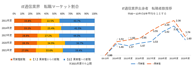 ※レポートでは業界毎に、上記の「転職マーケット割合」「転職者数推移」が掲載されています。