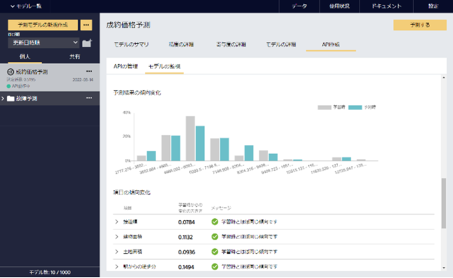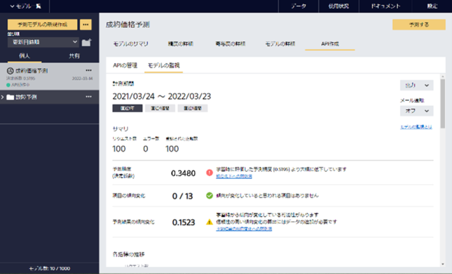 各モデルに対する稼働状況を確認することができます。現在動いているAPIのリクエスト数とエラー数、 予測精度や項目の傾向変化、予測結果の変化といった予測APIに使用しているデータが 学習時から変化しているかをサマリとして確認することが可能になります。