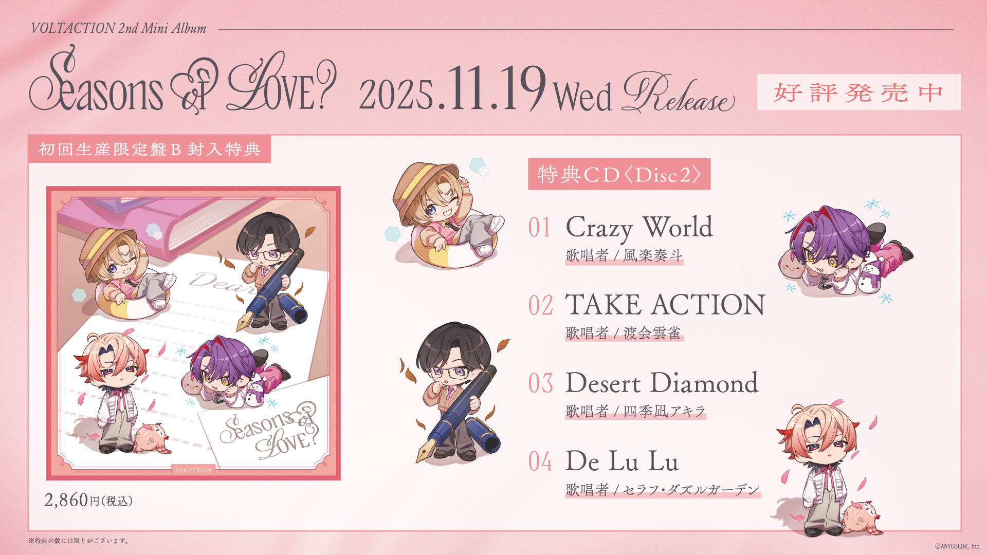 ANYCOLOR株式会社(本社:東京都港区 代表取締役:田角陸、以下「当社」)が運営するVTuber / バーチャルライバーグループ「にじさんじ」は、風楽奏斗、渡会雲雀、四季凪アキラ、セラフ・ダズルガーデンの4名によるユニット「VOLTACTION(ヴォルタクション)」が本日、2025年11月19日(水)に発売する2nd Mini Album『Seasons of LOVE?』について、メンバー・楽曲クリエイターコメントの到着、カラオケ配信開始、DAM CHANNELへの出演情報をお伝えいたします。