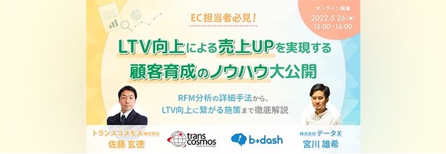 トランスコスモス株式会社(本社:東京都豊島区、代表取締役社長兼COO:奥田昌孝)は、オンラインセミナーEC担当者必見!LTV向上による売上UPを実現する顧客育成のノウハウ大公開を5月26日(木)に開催します。