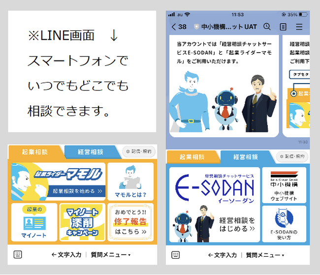 今回の統合により新しくなったLINEアカウント「中小機構_チャット経営・起業相談」では、メニューを切り替えて双方のサービスに簡単にアクセスできるようになりました。