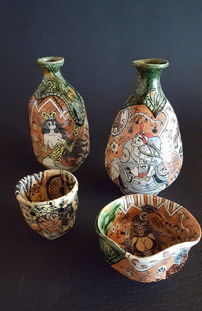 今回の個展で二度目になります。前回の個展から二年が経ちました。その間色々と挑戦してきました。絵付けのクオリティーアップ、新しい技法の取り入れ、引き出し黒などさまざまです。新作の漫画織部、春画織部などの遊びのある茶道具、酒器、人形や瀬戸黒などの伝統的な焼き物を出展致します。少しでも変化、成長を感じていただけたら幸いです。