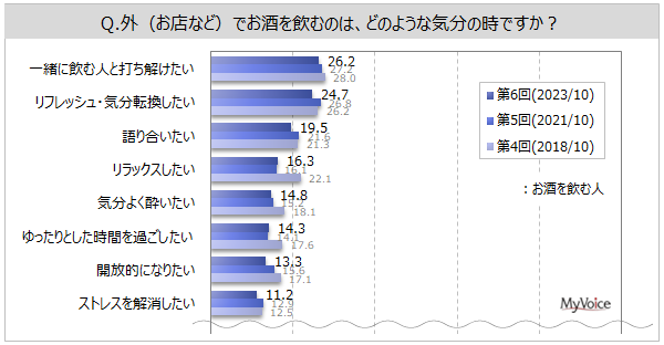 お酒を飲む人に、どのような気分の時に”外“でお酒を飲むかを聞きました(複数回答)。「一緒に飲む人と打ち解けたい」「リフレッシュ・気分転換したい」が25〜26%、「語り合いたい」「リラックスしたい」が各2割弱となっています。