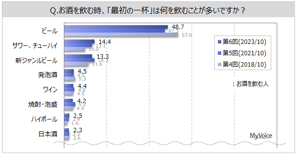 お酒を飲む人に、最初の一杯に何を飲むことが多いかを聞きました(複数回答)。「ビール」が48.7%、「サワー、チューハイ」「新ジャンルビール」が各1割強です。