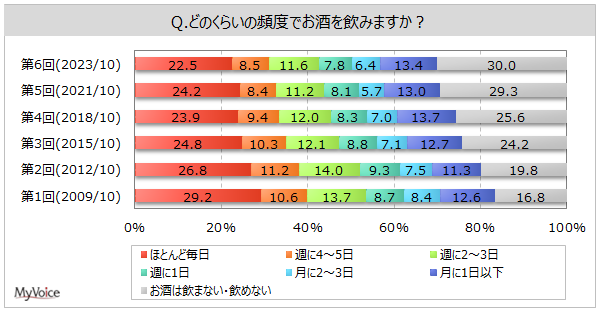 マイボイスコム株式会社(東京都千代田区、代表取締役社長:高井和久)は、6回目となる『お酒の飲用』に関するインターネット調査を2023年10月1日〜5日に実施しました。調査結果をお知らせします。