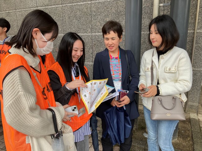 韓国人観光客からは、「おいしいお寿司を食べに行きたい」、「新潟県産の日本酒を購入したいが、どこで買えるのか」などの問い合わせがあり、学生たちは乗客らと一緒に地図を広げながら学んできた韓国語で通訳ガイドとして奮闘しました。