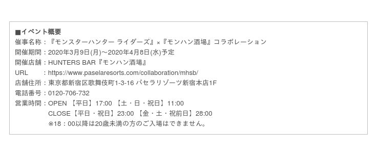 また、東京都新宿区にあるHUNTERS BAR『モンハン酒場』にて、3月9日(月)〜4月8日(水)、本作とのコラボレーション展開が決定しました。