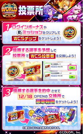 キャンペーン期間中は、「WCS記念ミッション」や「WCS記念ログインボーナス」などで、「WCSチップ」が手に入ります。この「WCSチップ」を集めたら、大会に出場する全8名の選手のうち “誰が優勝するのか” を予想し、「WCS投票所」でその選手の「WCS投票券」と交換しましょう。