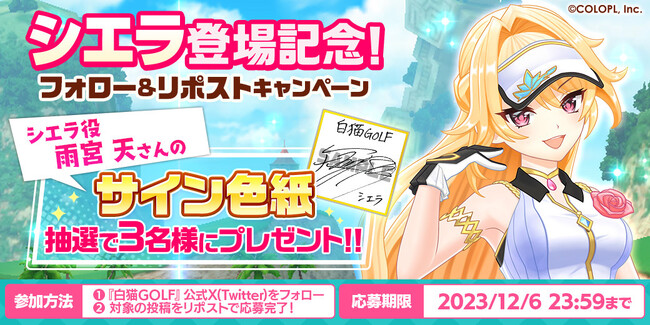 株式会社コロプラ(代表取締役社長:宮本貴志、本社:東京都港区、以下「コロプラ」)は、スマートフォン向けゲーム『白猫GOLF』にて、新ゴルファー「シエラ(CV:雨宮 天)」が登場したことをお知らせします。