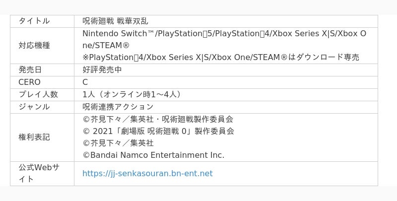 株式会社バンダイナムコエンターテインメントは、PlayStation(R)5/PlayStation(R)4/Nintendo Switch(TM)/Xbox Series X|S/Xbox One/STEAM(R)にて好評発売中の『呪術廻戦』初の家庭用ゲーム「呪術廻戦 戦華双乱」において、本日より無料アップデート第3弾・有料DLC「京都校女子衣装セット」の配信を開始いたしました。