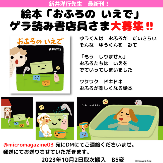 マイクロマガジン社(東京都中央区)は、2023年10月刊行予定の新作絵本『おふろの いえで』のゲラ(校了前の原稿)を読んでくださる書店員さんを募集しております。