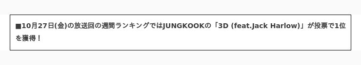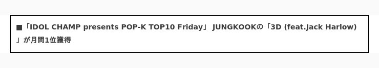 『IDOL CHAMP presents POP-K TOP10 Friday』10月27日(金)の放送回において、JUNGKOOKの「3D (feat.Jack Harlow)」が、チャート投票で2週連続で1位を獲得し、今週のNo.1曲として番組内で放送されました。