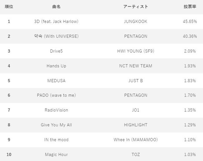 『IDOL CHAMP presents POP-K TOP10 Friday』10月の放送回の総合投票数で決まる月間1位はJUNGKOOKの「3D (feat. Jack Harlow)」となり、10月のMVPとして番組内で放送されました。「IDOL CHAMP」のファン投票では表示の結果となりました。